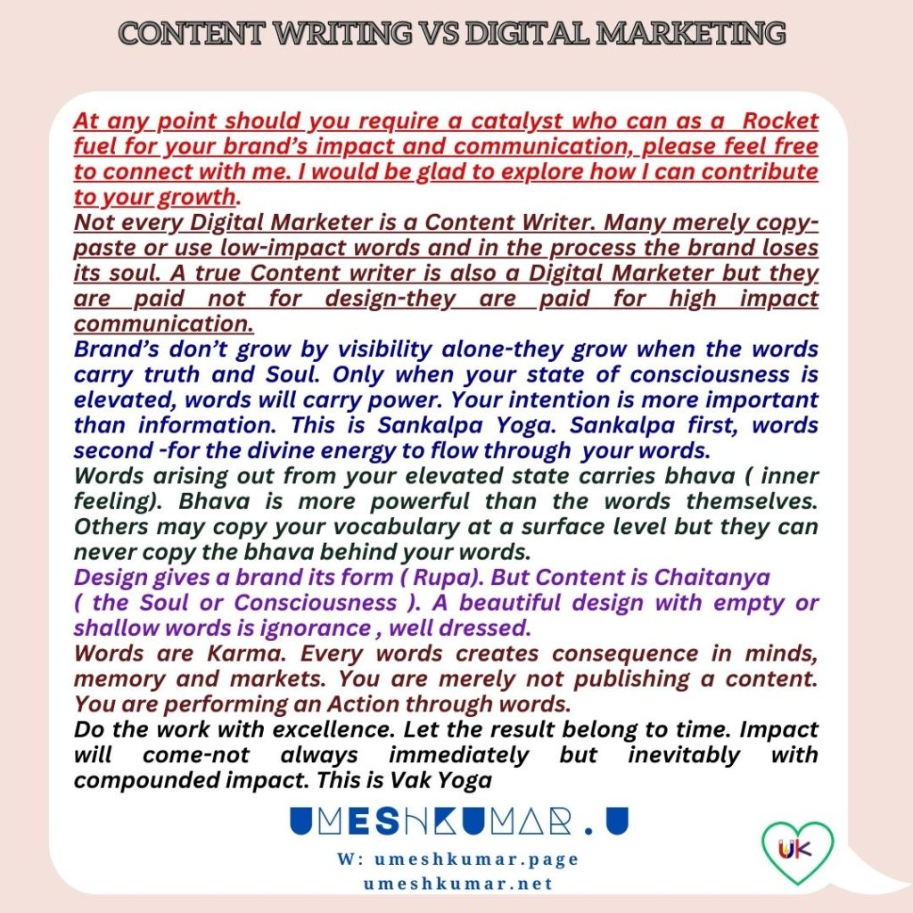 CONTENT WRITING VS DIGITAL MARKETING UMESHKUMAR UDecember 28, 2025December 28, 2025 Marketing No Comments BRAND, content marketing, digital marketing ← MEDITATION ON BIRTH YOUR HIGHEST ENEMY IS FEAR NOT FAILURE → Leave a Reply Cancel replyYour email address will not be published. Required fields are marked *Comment * Name * Email * Website Save my name, email, and website in this browser for the next time I comment.