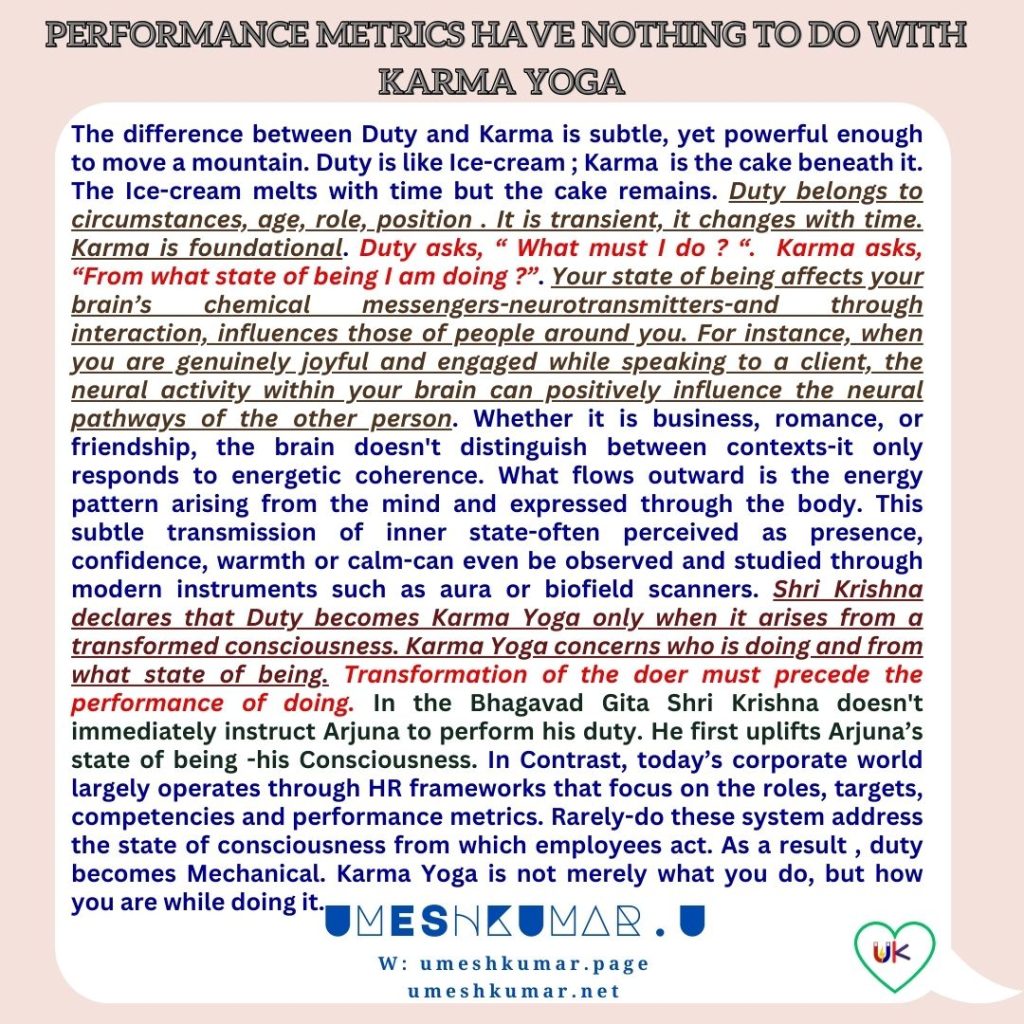 PERFORMANCE METRICS HAVE NOTHING TO DO WITH KARMA YOGA UMESHKUMAR UDecember 21, 2025December 21, 2025 Marketing No Comments duty, KARMA YOGA, performance ← WORK WITH LOVE NOT FOR AMBITION Leave a Reply Cancel replyYour email address will not be published. Required fields are marked *Comment * Name * Email * Website Save my name, email, and website in this browser for the next time I comment.