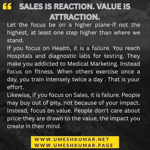 SALES IS REACTION. VALUE IS ATTRACTION. UMESHKUMAR UDecember 21, 2025December 21, 2025 Marketing No Comments sales, VALUE ← EFFORT IS INWARD,VALUE IS OUTWARD WORK SHOULD BE WORSHIP → Leave a Reply Cancel replyYour email address will not be published. Required fields are marked *Comment * Name * Email * Website Save my name, email, and website in this browser for the next time I comment.