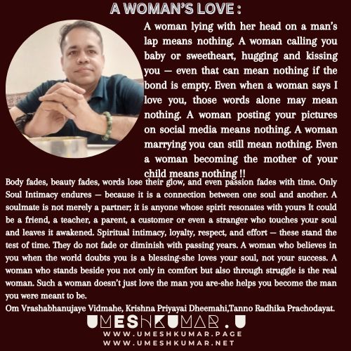 A WOMAN’S LOVE UMESHKUMAR UOctober 26, 2025October 26, 2025 Wisdom No Comments SPIRITUAL INTIMACY, WOMAN'S LOVE ← LIVE WITH FREEDOM AND AWARENESS DEVOTION-BEYOND SUCCESS → Leave a Reply Cancel replyYour email address will not be published. Required fields are marked *Comment * Name * Email * Website Save my name, email, and website in this browser for the next time I comment.