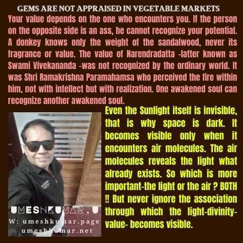 GEMS ARE NOT APPRAISED IN VEGETABLE MARKETS UMESHKUMAR UDecember 25, 2025December 25, 2025 Wisdom No Comments VALUE ← MERRY CHRISTMAS Leave a Reply Cancel replyYour email address will not be published. Required fields are marked *Comment * Name * Email * Website Save my name, email, and website in this browser for the next time I comment.