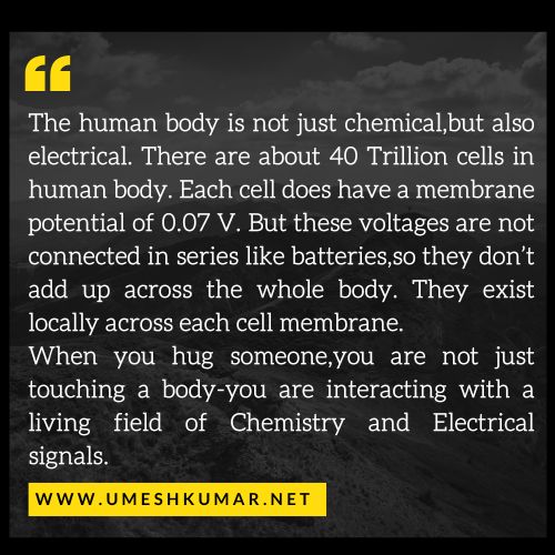 HUMAN BODY IS NOT JUST CHEMICAL UMESHKUMAR UApril 26, 2026April 26, 2026 Wisdom No Comments CHEMICAL, ELECTRICAL, HUMAN BODY ← INTELLIGENCE MAKES YOU SELECTIVE RE-SALE VALUE → Leave a Reply Cancel replyYour email address will not be published. Required fields are marked *Comment * Name * Email * Website Save my name, email, and website in this browser for the next time I comment.