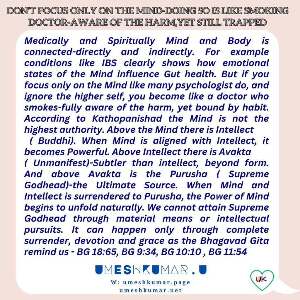 MIND ALONE IS NOT ENOUGH UMESHKUMAR UDecember 7, 2025December 7, 2025 Wisdom No Comments mind, purusha, smoking doctor, unmanifest ← DON’T COUNT SUCCESS BY WHAT YOU SELL. MANAGING TIME IS ONLY A SURFACE SKILL → Leave a Reply Cancel replyYour email address will not be published. Required fields are marked *Comment * Name * Email * Website Save my name, email, and website in this browser for the next time I comment.