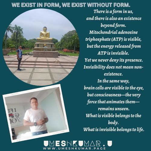 WE EXIST IN FORM, WE EXIST WITHOUT FORM UMESHKUMAR UNovember 23, 2025 Wisdom No Comments Existence with form and without form ← MARKETING IN ITS HIGHEST FORM YOU ARE VICTORIOUS BEFORE YOU HAD A NAME → Leave a Reply Cancel replyYour email address will not be published. Required fields are marked *Comment * Name * Email * Website Save my name, email, and website in this browser for the next time I comment.