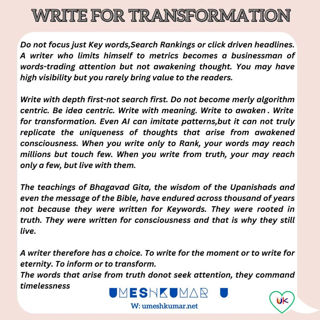WRITE FOR TRANSFORMATION, NOT JUST FOR SEARCH UMESHKUMAR UApril 8, 2026April 8, 2026 Wisdom No Comments KEYWORDS, TRASFORMATION, WRITER ← LET THE SUN PAY YOUR ELECTRICITY BILL Leave a Reply Cancel replyYour email address will not be published. Required fields are marked *Comment * Name * Email * Website Save my name, email, and website in this browser for the next time I comment.
