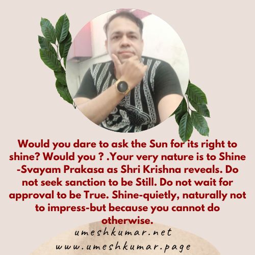 YOUR VERY NATURE IS TO SHINE UMESHKUMAR UJanuary 20, 2026January 20, 2026 Wisdom No Comments shine, svayam prakasa ← REJECTION IS THE PRICE OF VITALITY SILENCE MEANS RADIANT → Leave a Reply Cancel replyYour email address will not be published. Required fields are marked *Comment * Name * Email * Website Save my name, email, and website in this browser for the next time I comment.